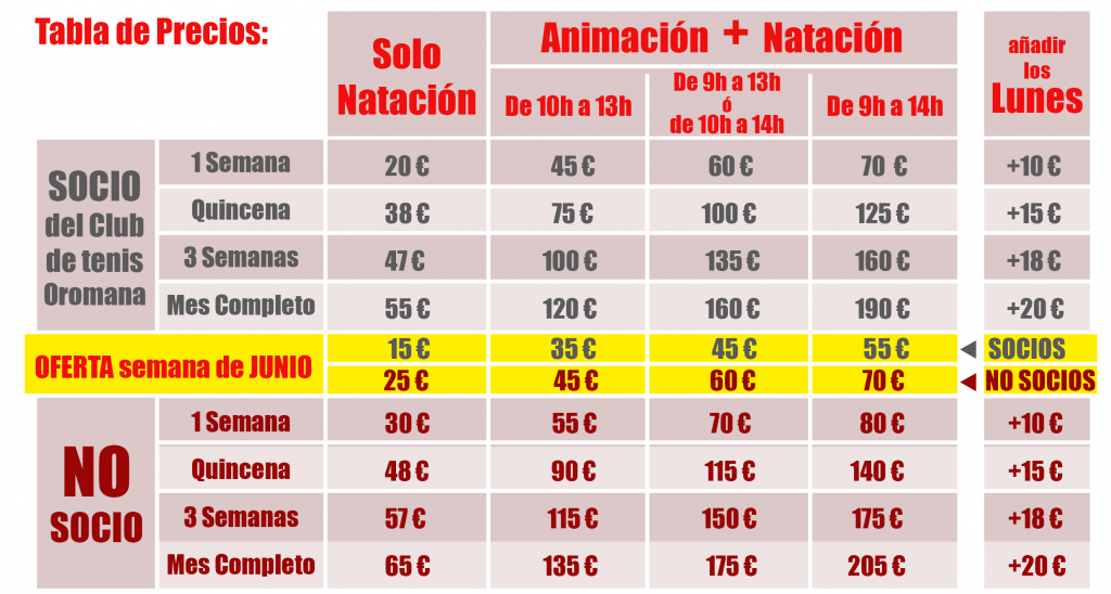 Reserva tu plaza rellenando este formulario. Posteriormente, los martes y jueves de junio en horario de 18:00 a 21:00, estaremos en las instalaciones del Club Oromana para que puedas formalizarla y realizar el pago.